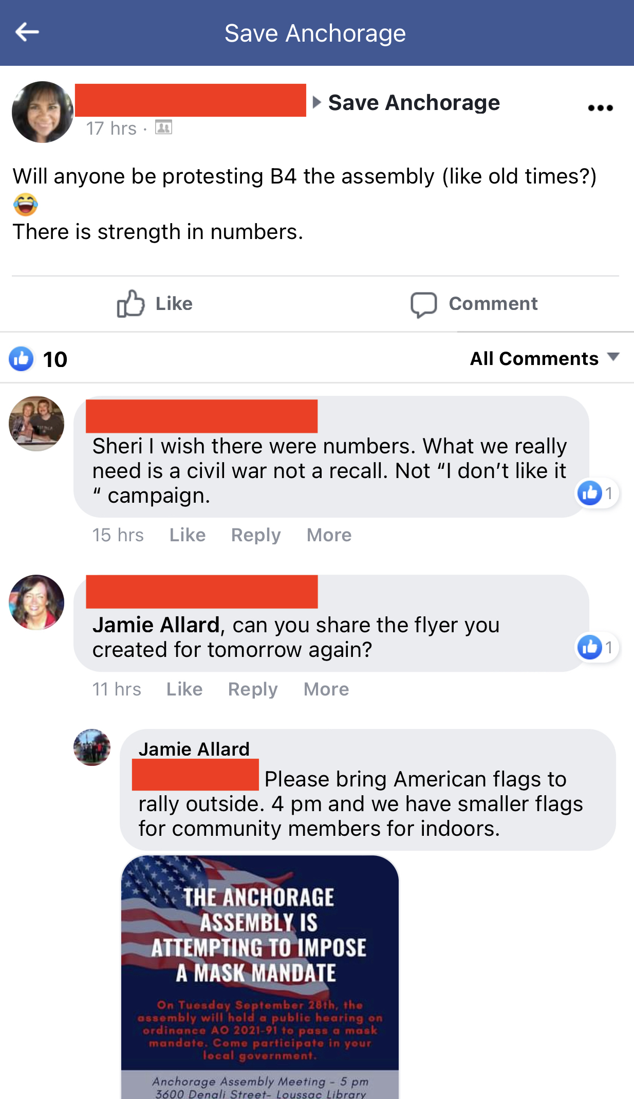The original post's author, who had just suggested there was strength in numbers, "liked" the comment made in support of civil war. Anchorage Assembly member Jamie Allard made an appearance in the thread, sharing a flyer that accused the Anchorage Assembly, of which she is a member, of attempting to pass a mask mandate.