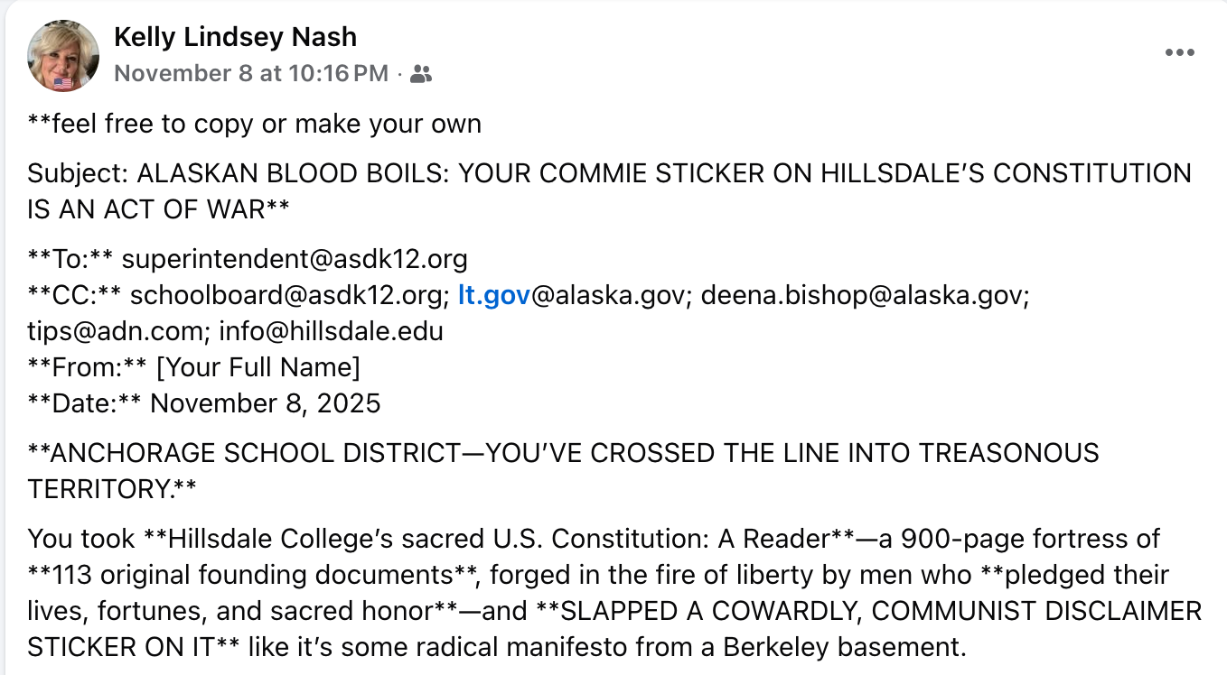 For a few days now, I've sat and watched Fairbanks resident, Kelly Lindsey Nash, spread nonsensical propaganda about the Anchorage School District - chiefly that the district placed a disclaimer on a copy of a constitution that had been distributed by Hillsdale College - a private, conservative, Christian liberal arts college located in Hillsdale, Michigan.