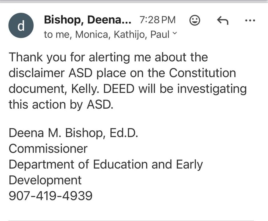 So incensed was Nash over a policy she wasn't aware of that she emailed Alaska's anti-public education DEED commissioner, Deena Bishop, who, in a purported response to Nash, stated that DEED would be INVESTIGATING the Anchorage School District's actions. You can almost feel the mouth foam spraying off of Bishop's email, and easily envision her eyes rolling into the back of her head.