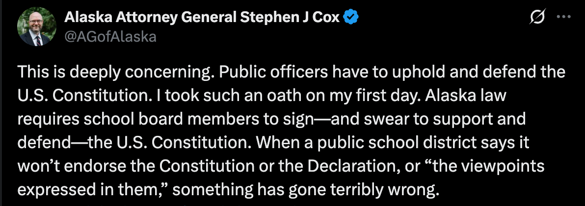 Anyway, this weekend's entire meltdown is just another chapter in MAGA’s never-ending saga of manufacturing outrage over absolutely nothing. A routine disclaimer - the kind used by school districts from Florida to Alaska - rather incredibly became a communist plot and excuse for Alaska’s top state officials to posture for the far-right. It’s pathetic, predictable, and exactly why incompetent people like Bishop shouldn't be anywhere near public education policy. If Bishop actually cared about education, she'd support teachers and advocate for adequately funding public education.