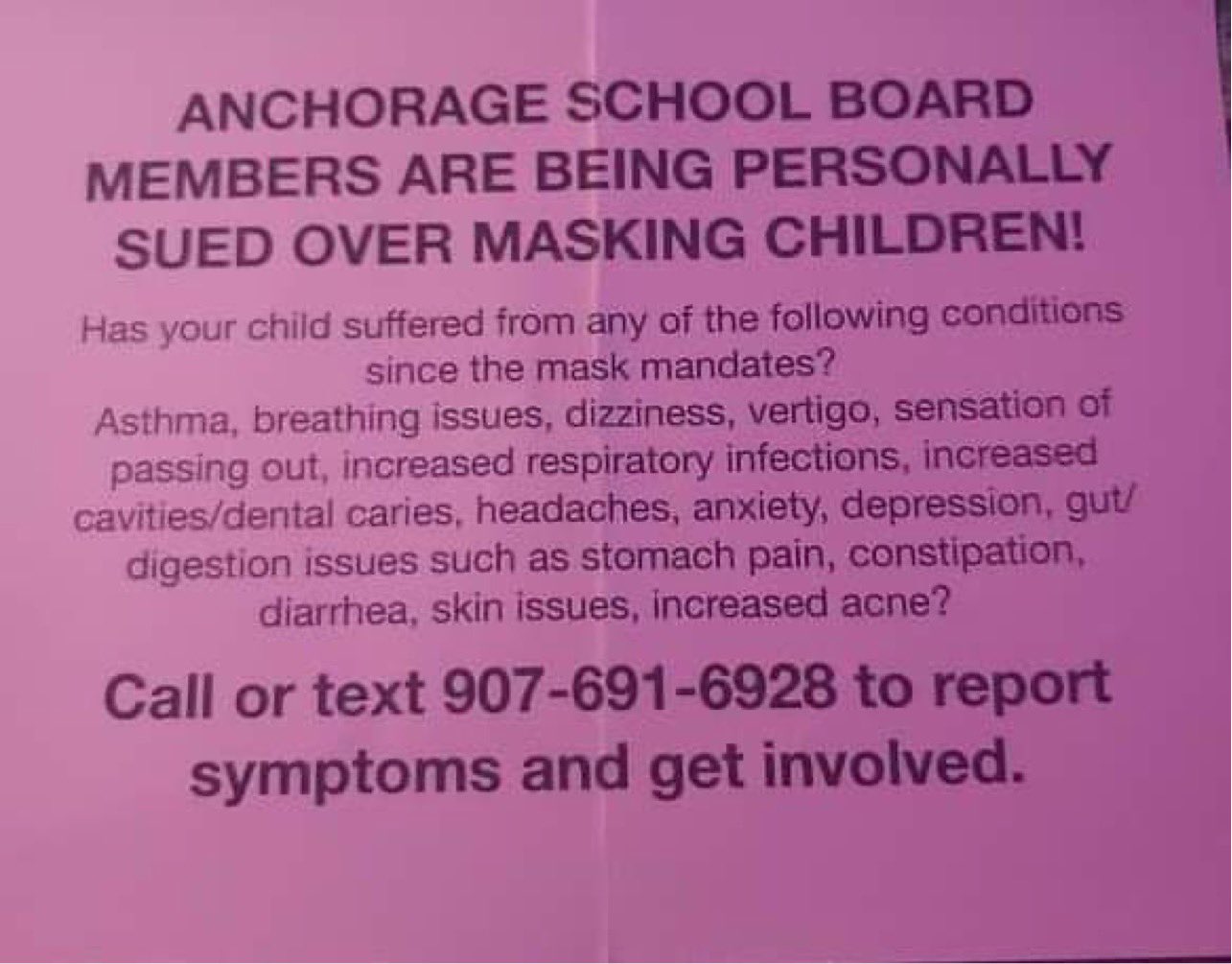Earlier this month I revealed that a flyer distributed by unknown individuals at Eagle River Assemblyperson Jamie Allard’s “Alaska Freedom Convoy” event claimed that members of the Anchorage School Board were going to be personally sued for masking children.