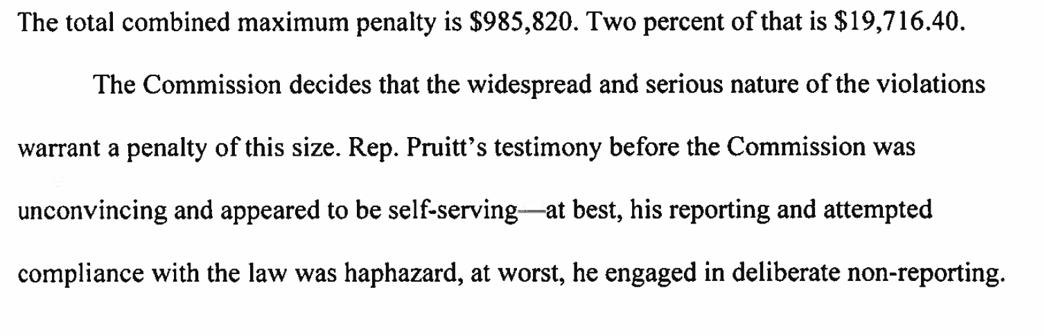 "The penalty amount must be high enough to ensure that he takes care to accurately file disclosure reports should he again be a candidate, legislator, or public officials subject to disclosure requirements" and ordered Pruitt to "amend his 2019 and 2020 legislative financial disclosures to include the clients who paid more than $1000 in a calendar year to his spouse's corporation and the range of amounts they paid."
