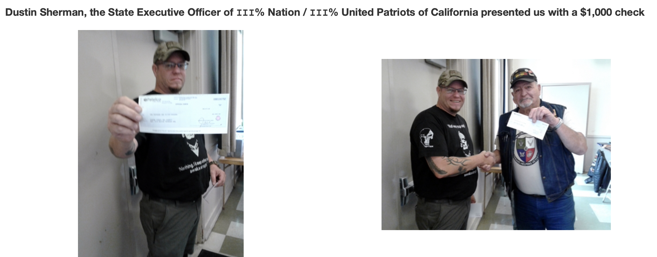 In 2018, Sherman presented a $1,000 check to Sonoma County Vet Connect, Inc., a nonprofit 501(c)(3) organization in California that assists veterans. A caption associated with the photographs identified him as the State Executive Officer of III% Nation and III% United Patriots of California.