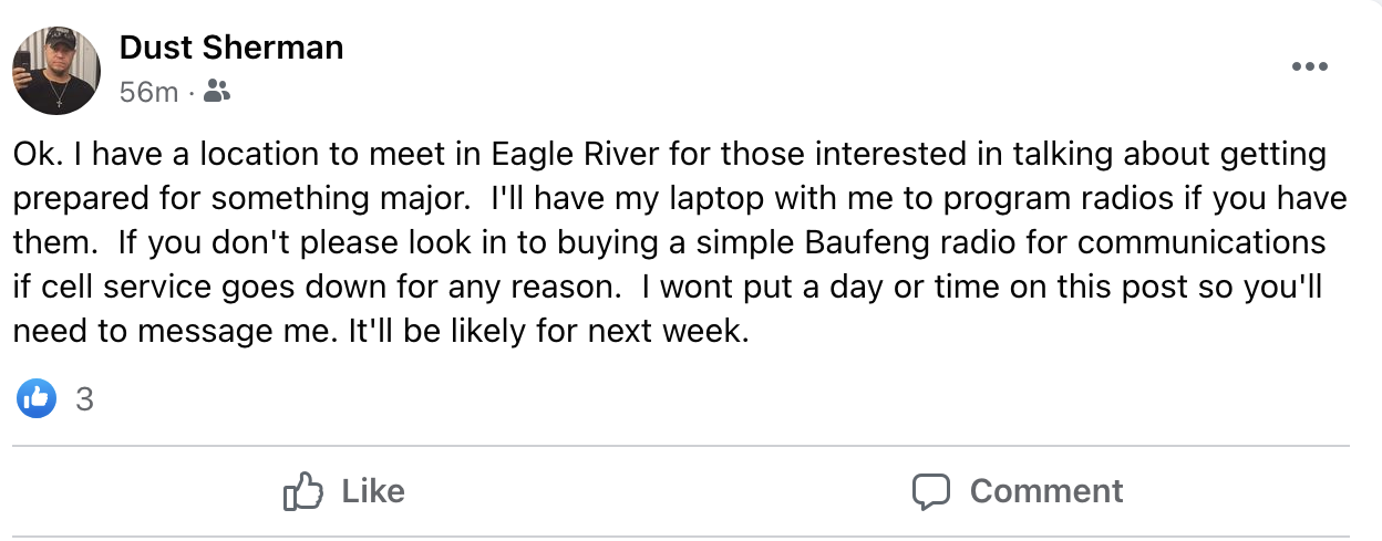 A Livestream recorded by Sherman on March 28, 2018, ahead of a Pro Second Amendment rally, and which was obtained by The Blue Alaskan, reveals that he and his "militia-type" group members participated in a Close Quarter Battle (CQB) training exercise involving roughly twenty people from three or four different groups including Oath Keepers, West Coast Patriots and III% United Patriots (III%UP) — one of the more significant III% movements around at the time.