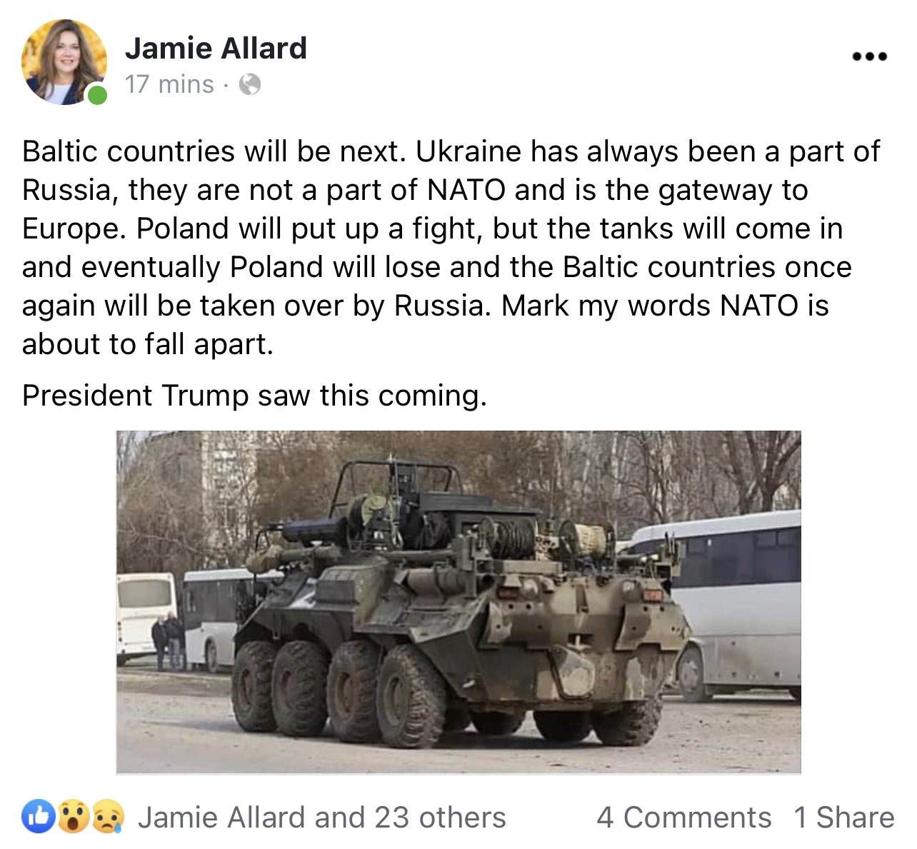 Allard also claimed in the same Facebook post that Ukraine has always been a part of Russia, even though the country has been independent since 1991.