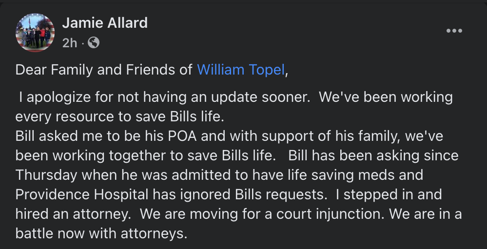 On her Facebook page this evening, Allard wrote that Mr. Topel had been asking for "lifesaving meds" since he was admitted on Thursday and that "Providence Hospital" had ignored Topel's requests. Allard said she had stepped in and hired an attorney intending to move for a court injunction. "We are in a battle now with attorneys," Allard wrote.