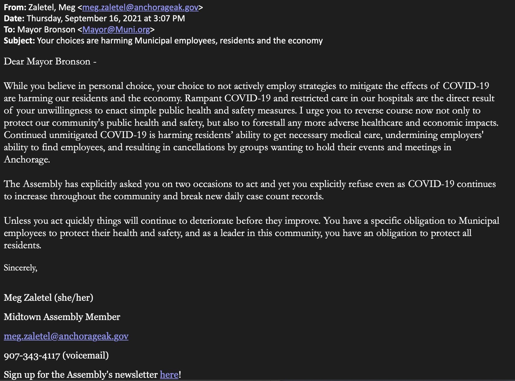 Zaletel, closing out her email, wrote that unless Mayor Bronson acted quickly, the situation in Anchorage would continue to deteriorate before they improve. She told the mayor that he had a "specific obligation to municipal employees to protect their health and safety," and that as a leader, Bronson also had an "obligation to protect all residents."