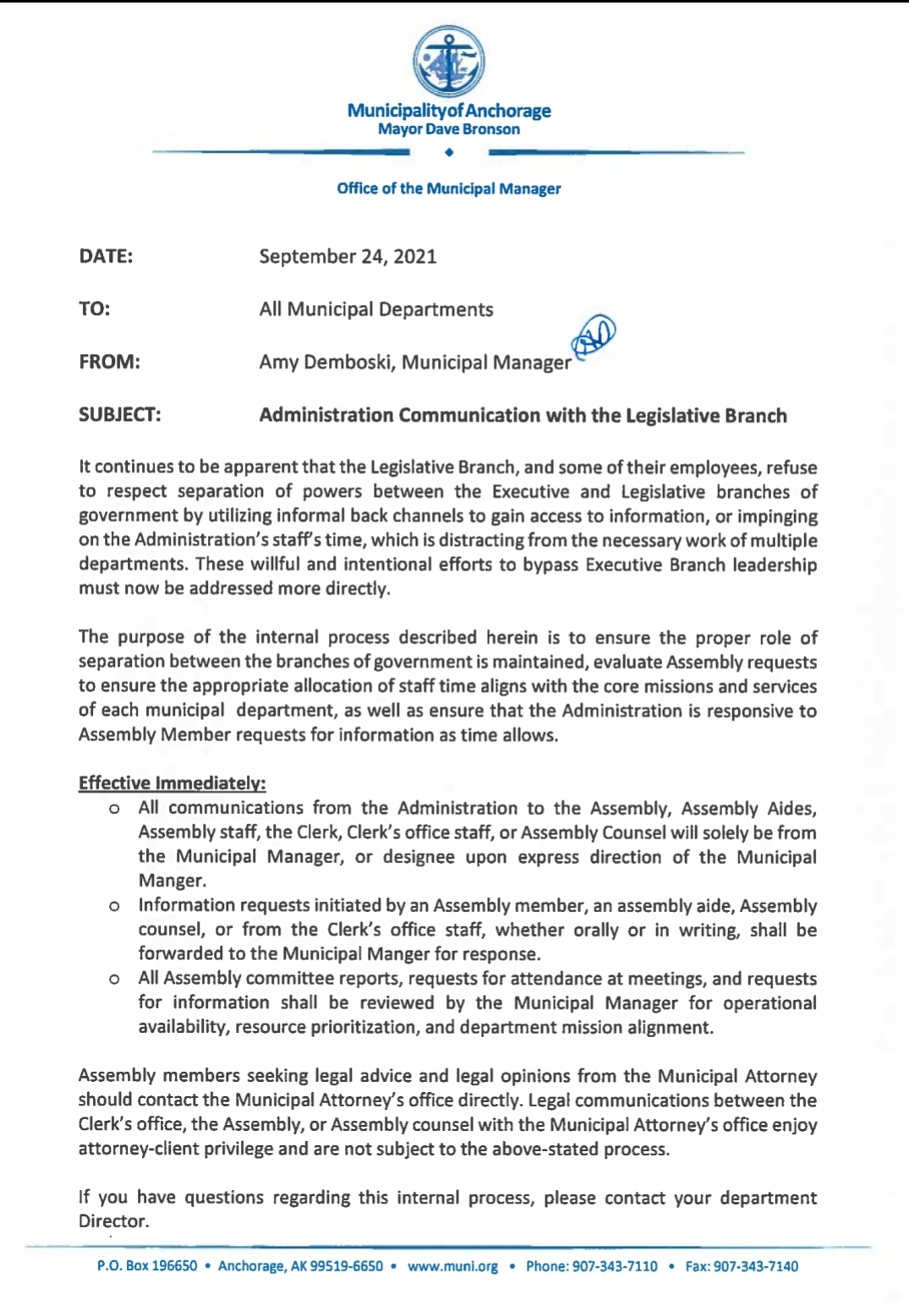 An email sent by Municipal Manager Amy Demboski to all Municipal Departments states that effective immediately, all communications from the administration to the Assembly, Assembly aides, Assembly staff, the Clerk, Clerk's Office Staff, or Assembly Counsel will now solely be sent through the Municipal Manager or designee.