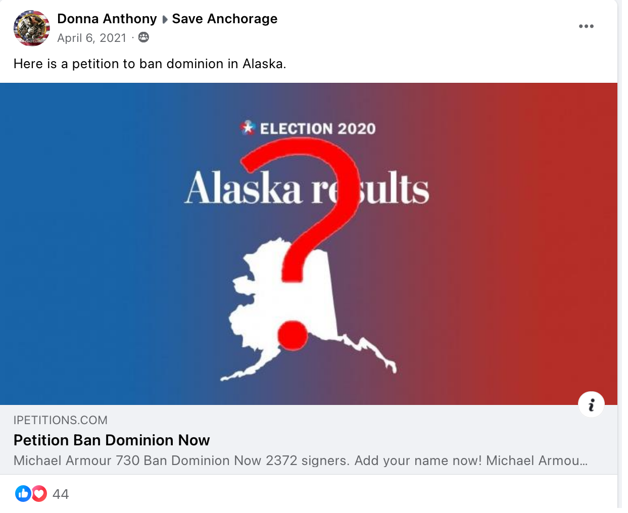 In April 2021, Anthony shared (and signed) a petition to ban the use of Dominion voting machines to tabulate Alaska's election results. A gentle reminder—Faux News agreed to pay Dominion $787.5 million in April to avoid a trial that would have revealed how Faux promoted lies about the 2020 presidential election.