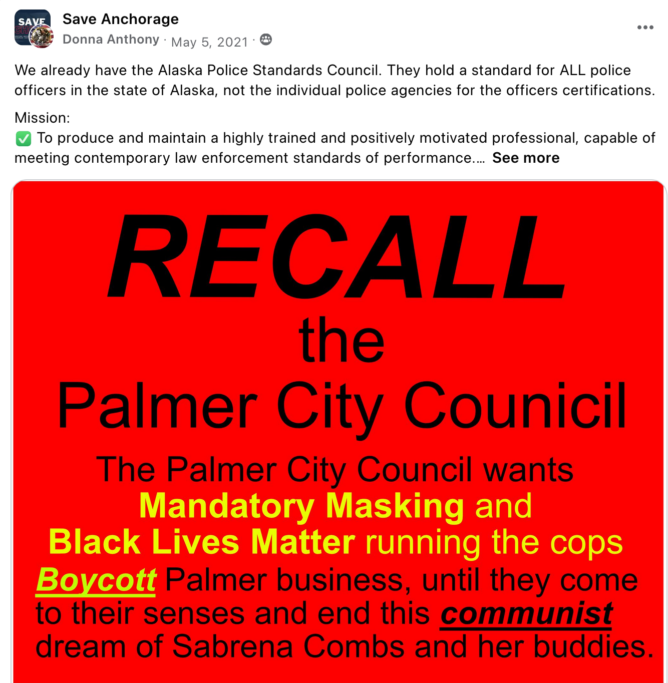 Oh, and I'd be remiss if I didn't point out that Anthony also promoted a flyer in support of recalling members of the Palmer City Council. The flyer claimed that the three 'communist visionary' Council members, with Sabrena Combs serving as ringleader, wanted...wait for it...Black Lives Matter running the police department.