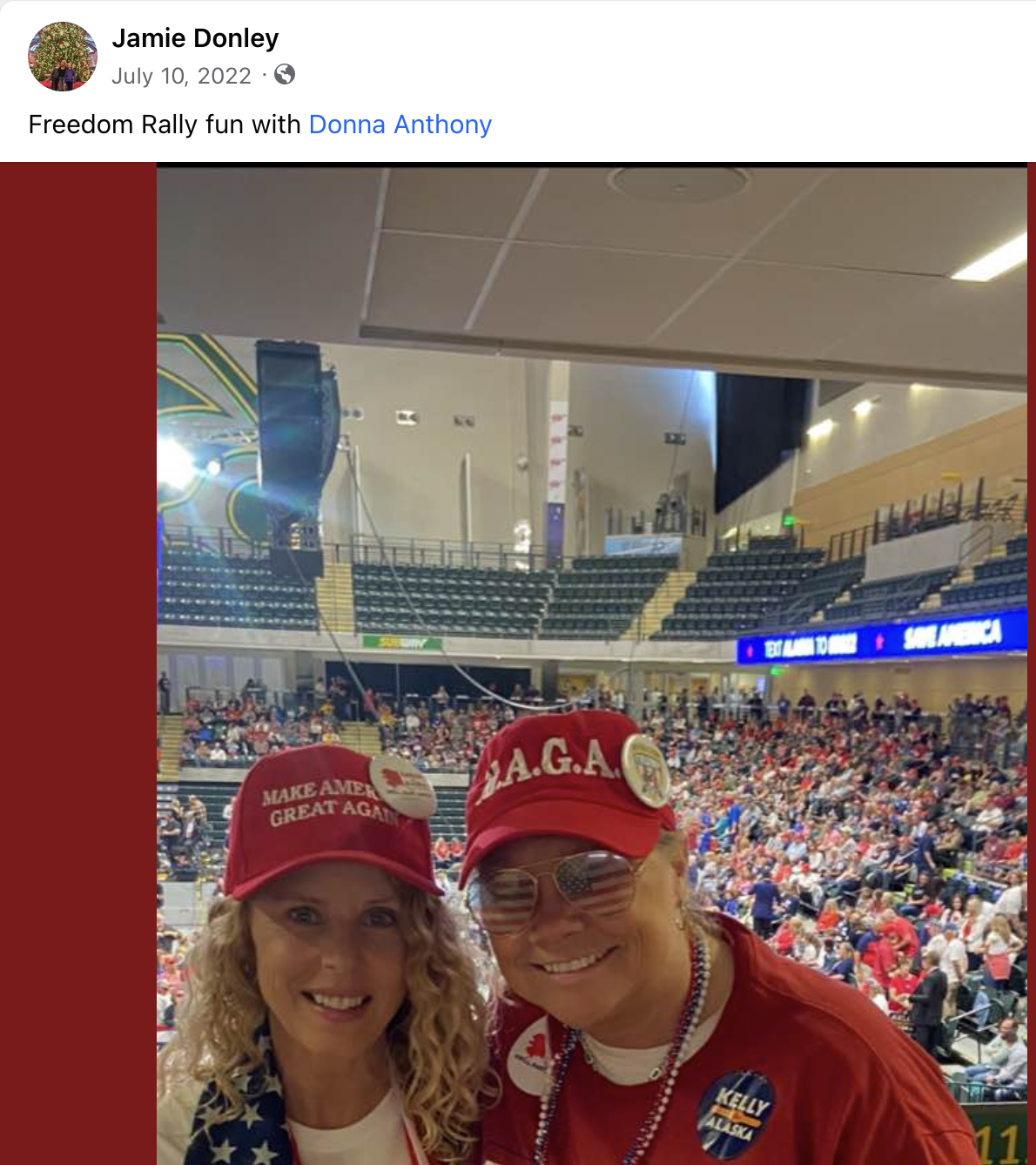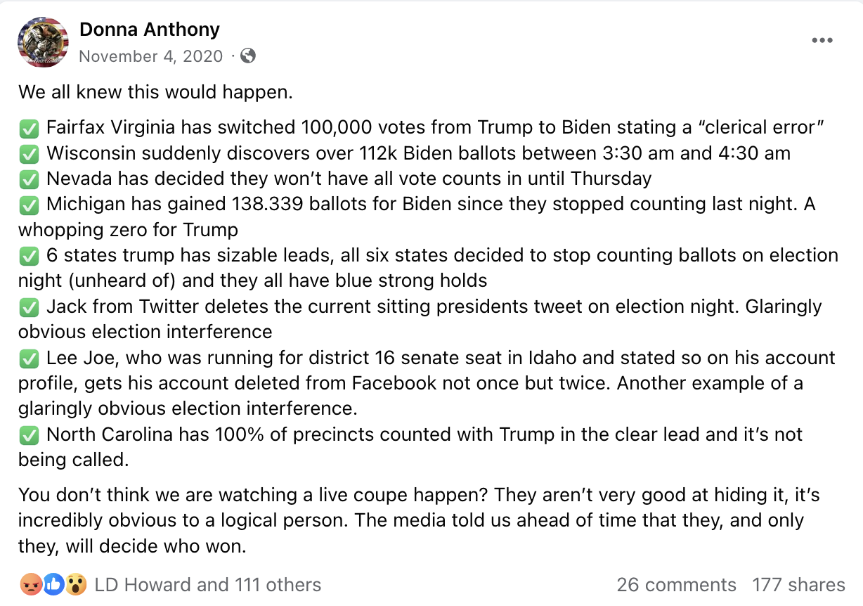 On November 4, 2020, as Joe Biden began pulling ahead of Donald Trump in the presidential election results, Anthony suggested in a Facebook post that Americans were witnessing a "live 'coupe' happening," spreading the baseless election fraud lies of the deranged orange indicted former president and his surrogates. Anthony's post was, of course, 'liked' by her counterpart, Officer Luke Howard of Palmer BLM fearmongering fame.
