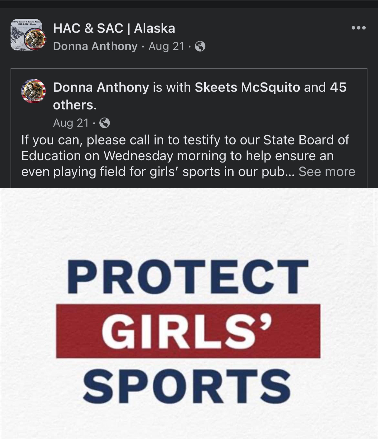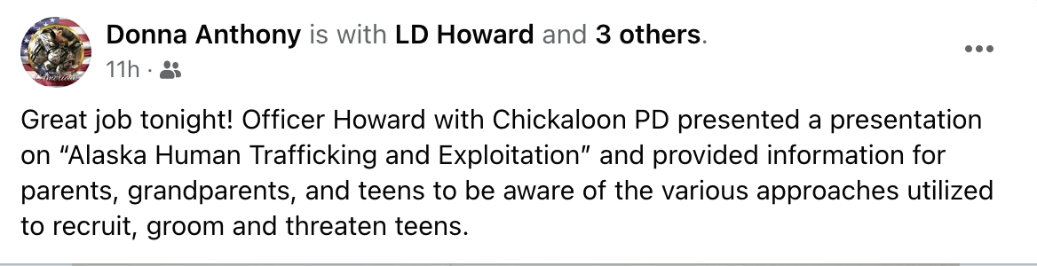 Anyway, Anthony thought last night's QAnon adjacent human trafficking awareness gathering went just swimmingly, posting to Facebook shortly after the event about the dangers of 'groomers'—a right-wing phrase slung by individuals such as Rep. Jamie Allard to vilify Alaska educators as child abusers and sexual predators.