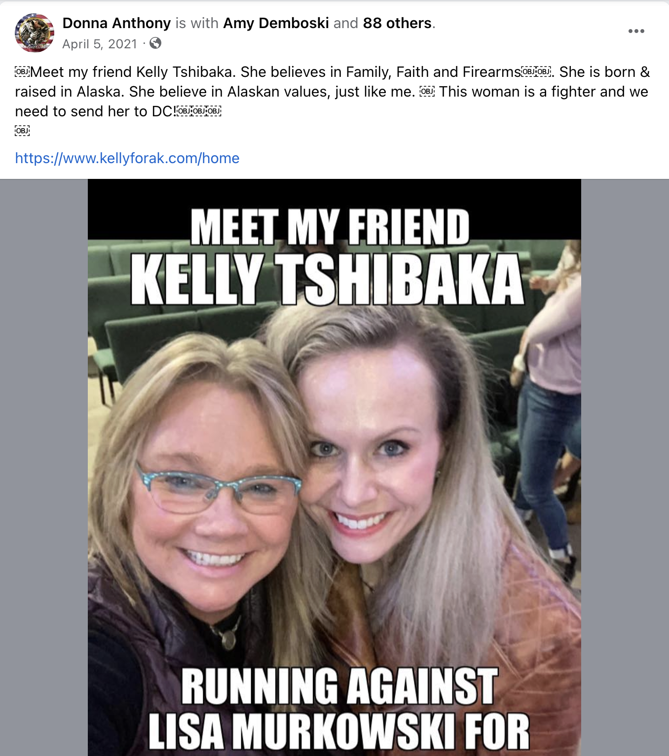 Allard isn't the only far-right politician Anthony keeps company with, naming election fraud conspiracy theorist and anti-LGBT demagogue Kelly Tshibaka in a Facebook post as a friend who shares her "Alaskan values."
