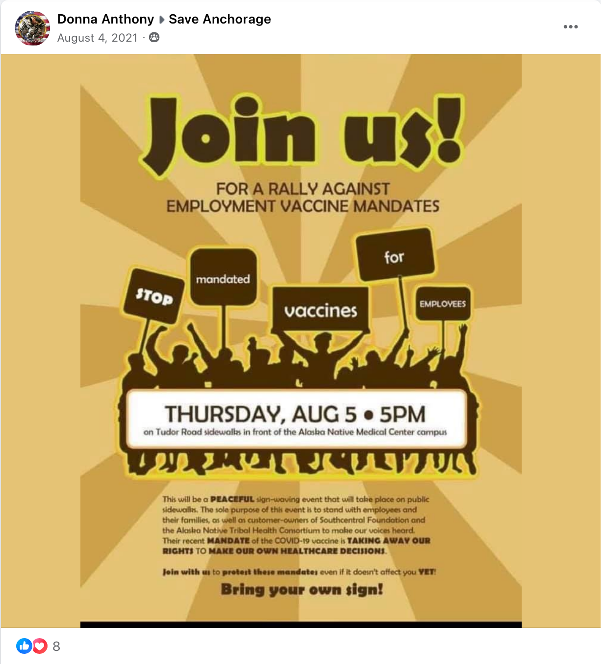 In 2021, Anthony shared an online flyer for an anti-vaccine rally targeting healthcare workers at the Alaska Native Tribal Health Consortium and South Central Foundation. You might recall that this was a time when COVID-19 insanity was all the rage among the far-right. The rally stood in stark contrast to an event organized by Anchorage residents who took the unusual step of actually supporting our healthcare heroes.