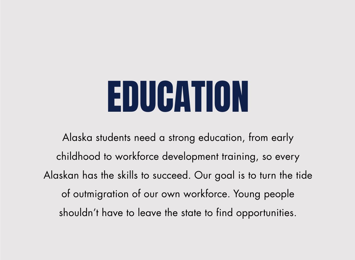Allow me to draw your attention to the Education section. Bishop writes that "Alaska students need a strong education" and that his goal is to "turn the tide of outmigration."