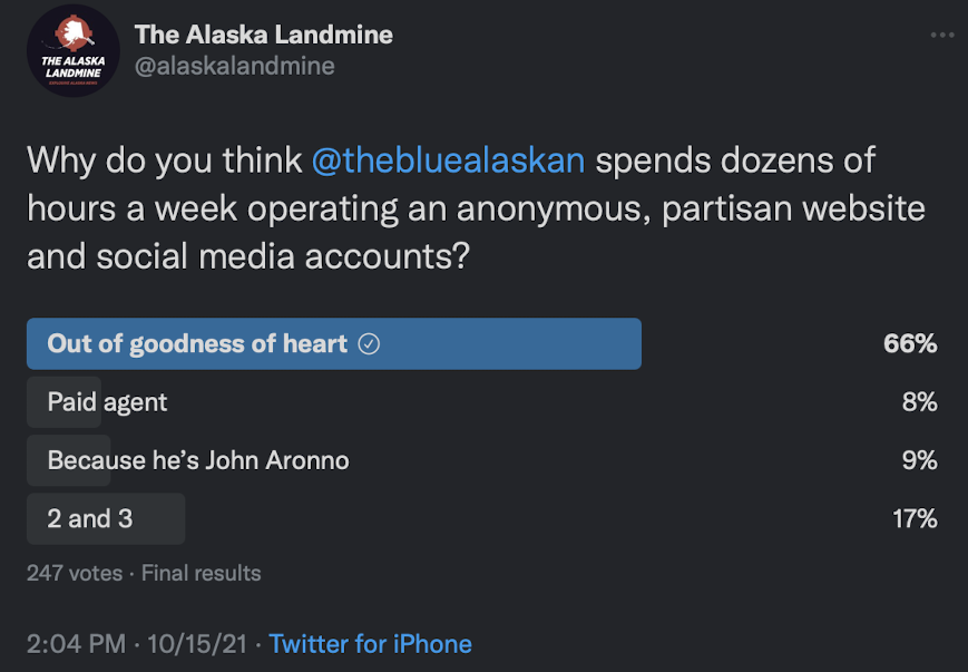With that being said, nobody from the Alaska Landmine reached out to me ahead of a “cash prize” being placed on my head. I find the cash prize both concerning and disappointing, to say nothing of the reckless act of naming individuals publicly as the author of The Blue Alaskan with no factual basis to do so.
