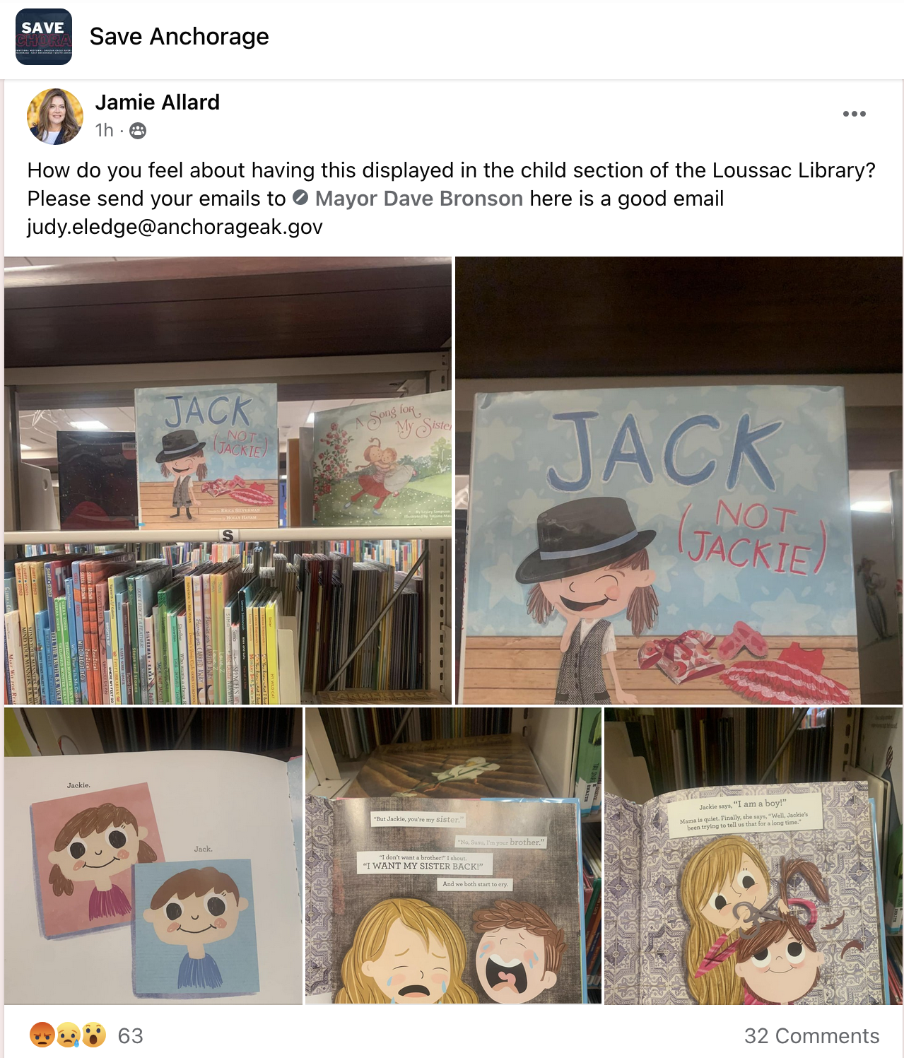 Eagle River Assembly Person Jamie Allard, who said she "truly believed" all transgender men and women were mentally ill on the Louisiana-based Dan Fagan Show in July, took to the shadowy private Save Anchorage operation last week in an attempt to generate outrage over a children's book on display at the Anchorage Public Library (APL).
