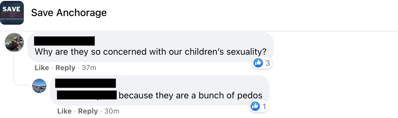 "It's a religious, Satanic attack on how God made us, male and female," wrote one Save Anchorage member in response to Allard's post, "If they really cared about children, they'd be exposing the gender-bending chemicals instead of mind-controlling children into their 'woke' agenda."