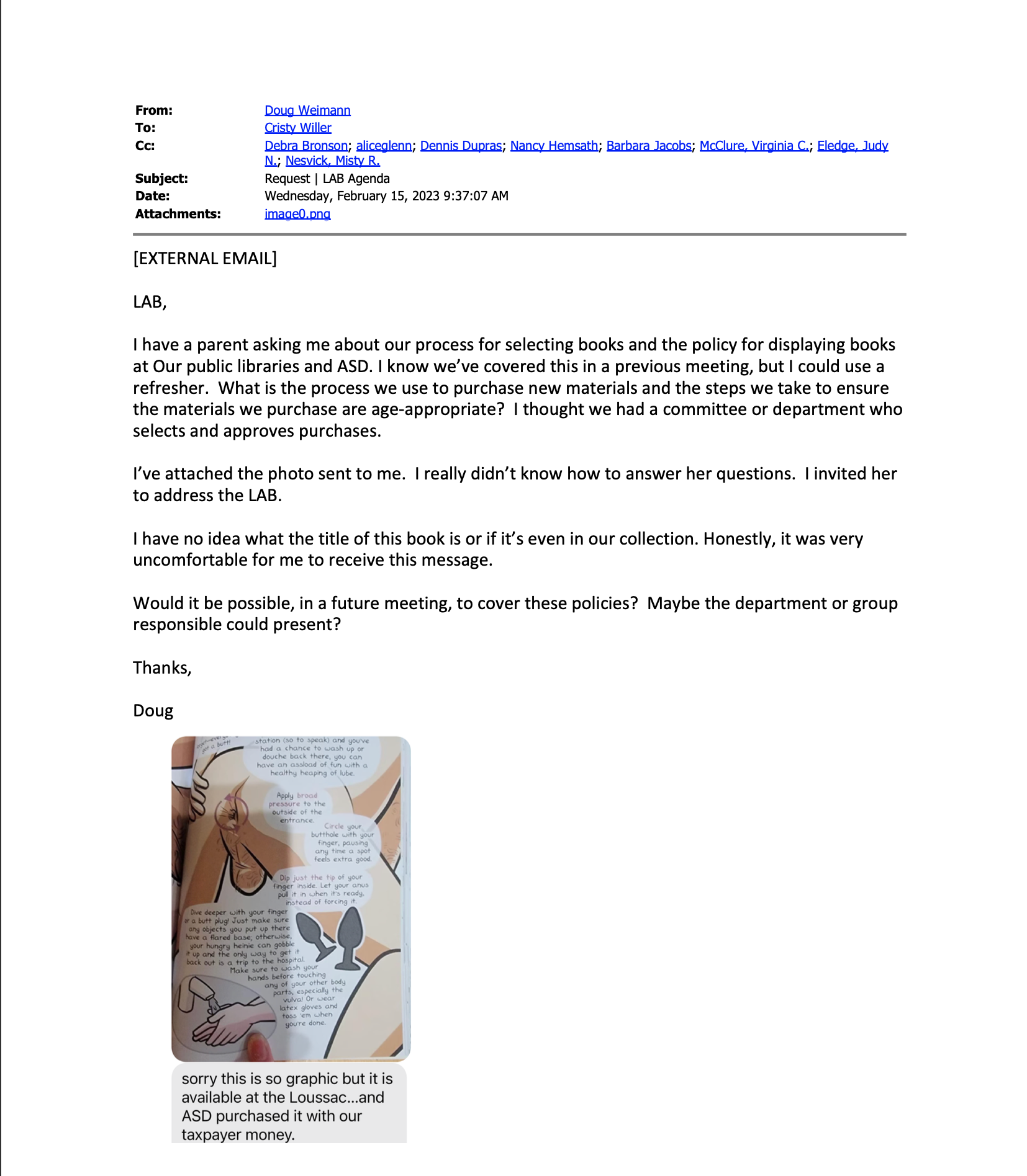 "It seems pretty clear to me that we're breaking the law by having that book available to anyone who's under eighteen years of age," said Weimann during last month's LAB meeting.