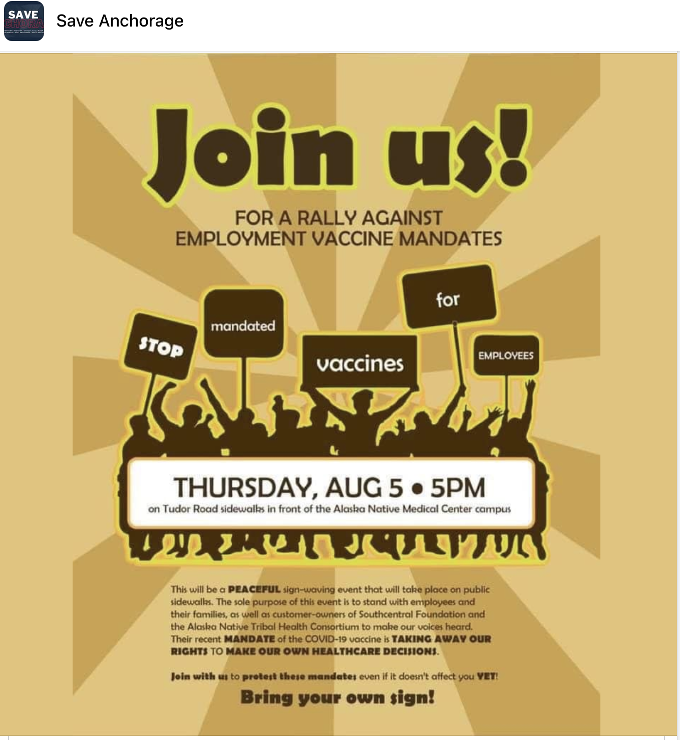 Anyway, the rally is labeled as a "peaceful" sign-waving event held on public sidewalks in front of the Alaska Native Medical Center campus on August 5 at 5 pm.
