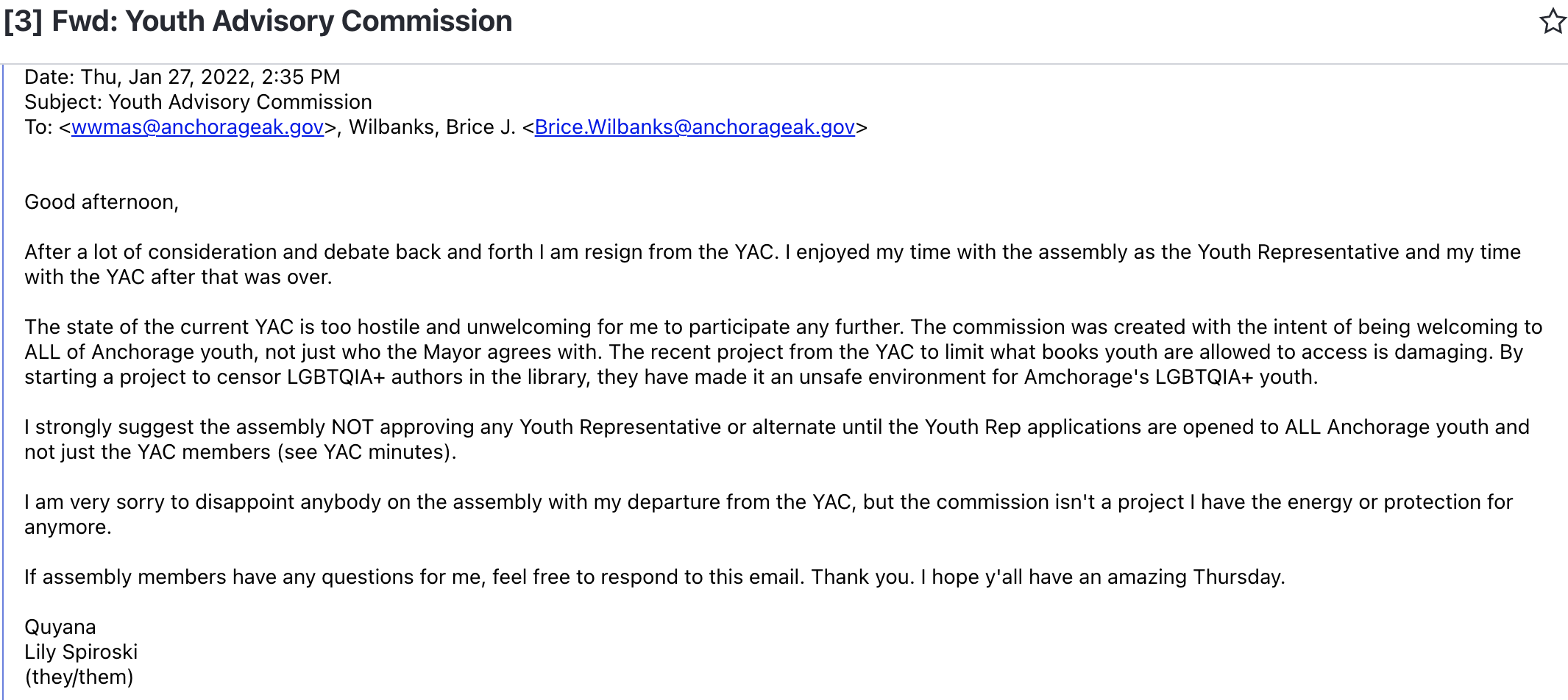 In response to YAC's unexplained and strange move, Spiroski told the Anchorage Assembly in their resignation letter that they strongly suggested that until Youth Representative applications were again open to all Anchorage youth, they should not approve any youth or alternative representatives from YAC.