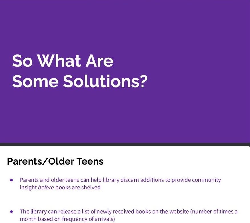 At the bottom of the screenshot, the project's creator(s) suggested that as a 'solution' to the LGBT books found at the library, parents and older teens could help the library "discern additions to provide community insight before books are shelved."