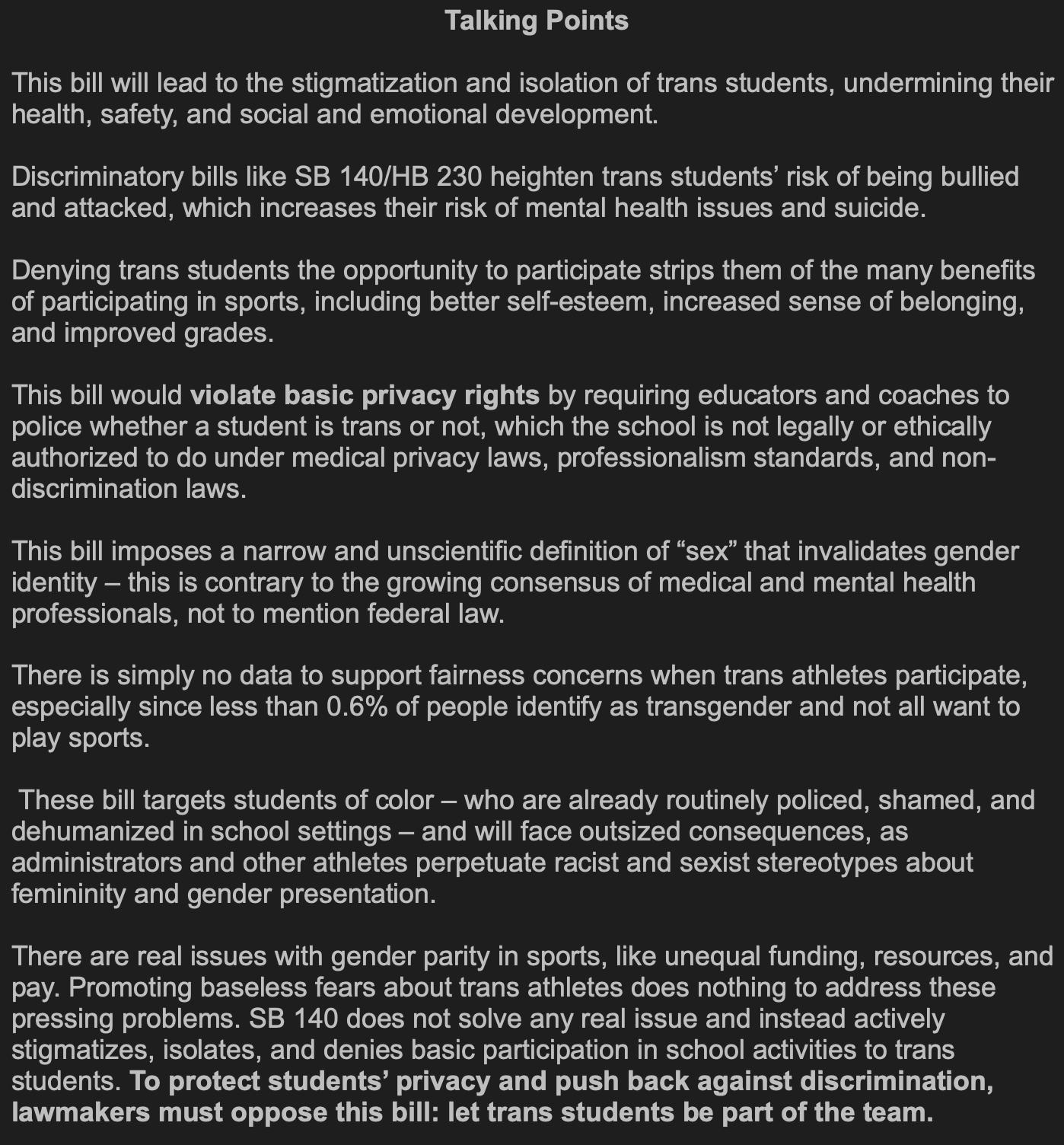 SB 140, a blatantly discriminatory bill designed to exclude transgender girls and deny them the ability to participate fully in sports and the school community, has a hearing this week.