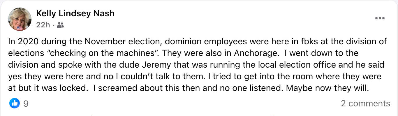 In her post-game analysis, she explicitly targeted Fairbanks North Star Borough Clerk April Trickey, accusing her on Facebook of knowing about election fraud and covering it up to avoid prison. "April Tricky [sic] is completely aware of the fraud she’s just afriad [sic] to end up like Tina Peters," Nash wrote.