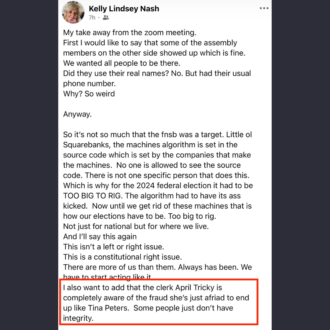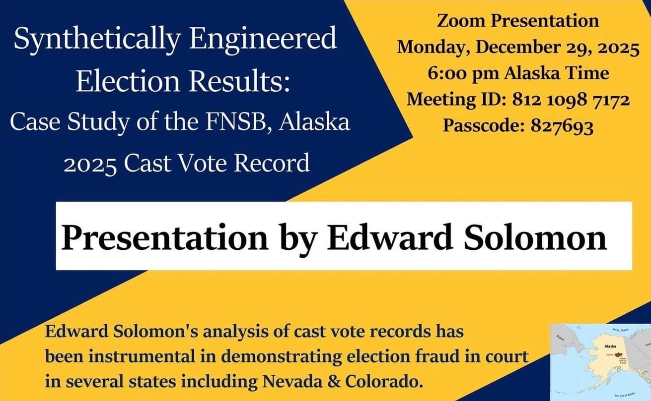 In a social media post leading up to last evening's Zoom event, Nash alleged that 2,000 votes in the local election were flipped from a Republican to a Democrat. She presented this claim against a red background without providing immediate evidence and used the post to build anticipation for the meeting, instructing followers to "tune in" for details regarding the FNSB's "synthetically engineered elections."