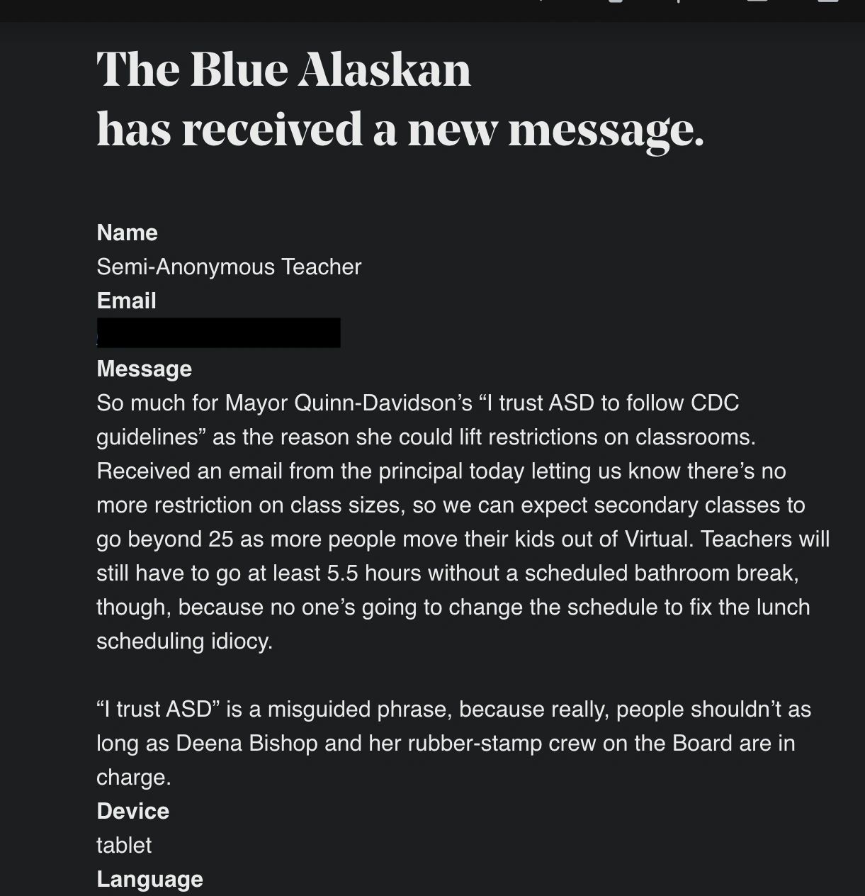 Last year I spent a large portion of my time talking to ASD staff. This was during a time when certain school board members and Dr. Bishop were working overtime to cram everyone back into classrooms as our COVID-19 cases were steadily climbing. In all of my discussions with parents and ASD staff it became abundantly clear, to me at least, and in my opinion, that the district was working to bend the CDC guidelines to their will in an effort to further what many saw as an agenda.