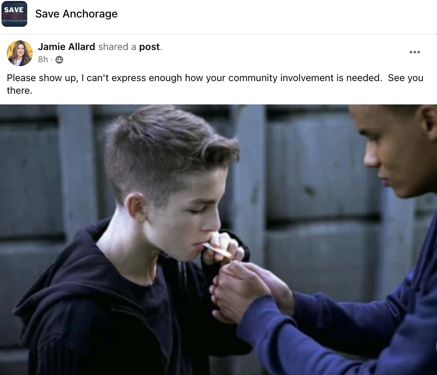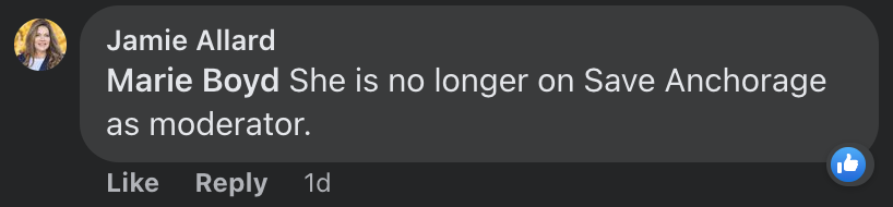 In public comments made to Allard's official/not official Facebook account on Thursday, Schopp accused Allard of being biased and called her use of such a photo disappointing. Schopp, who had deleted Allard's Save Anchorage post, also claimed that the photograph attached as part of Allard's post ran afoul of the group's rules. However, she provided her the opportunity to repost it without the picture.