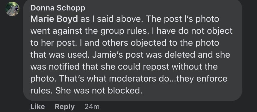 Allard, seemingly unamused that a mere mortal moderator had dared to trifle with her post, somehow managed to get the post Schopp had told her violated the group's rules approved — assumably through a higher-ranking group administrator.