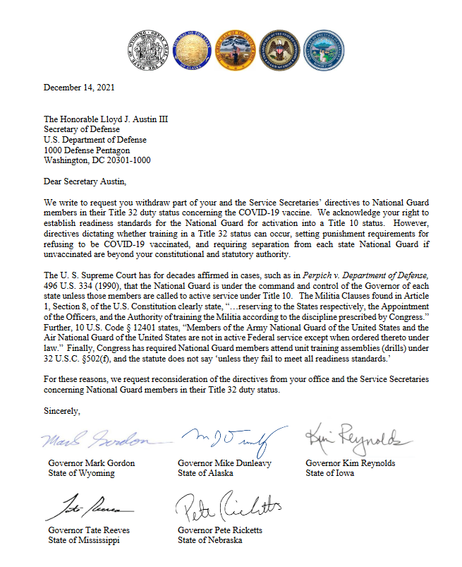 Right-wing Alaska Governor Michael Dunleavy joined the governors of Wyoming, Iowa, Mississippi, and Nebraska yesterday — signing a letter addressed to Secretary of Defense Lloyd Austin III — asking him to withdraw the COVID-19 vaccination requirement for each state's National Guard.
