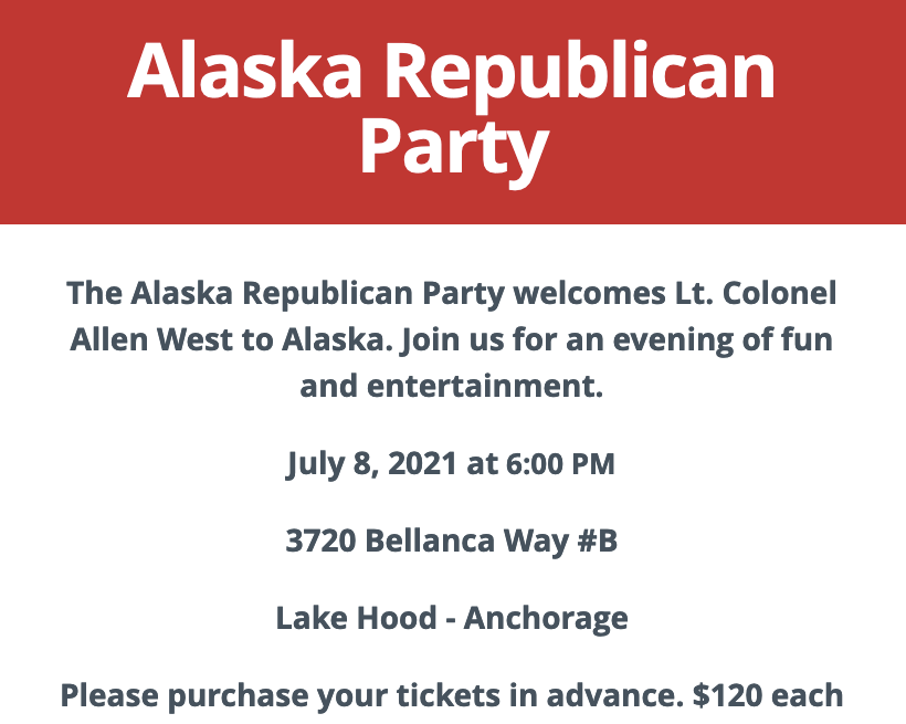 West will be in Alaska for an event hosted by the Alaska Republican party on July 8.
