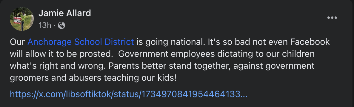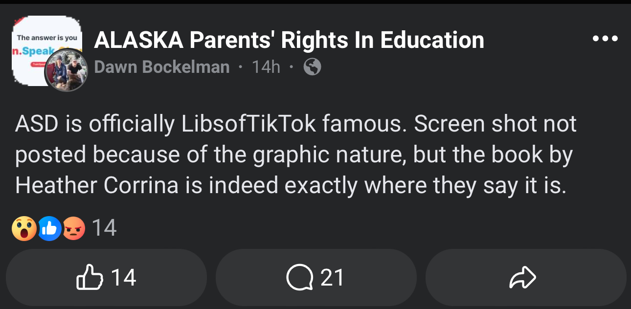 The post was made to the Facebook group belonging to the anti-government organization Alaska Parents' Rights in Education, which believes LGBT advocates “groom preschool children at libraries” and that LGBTQ militant activism is fostered in public and school libraries.