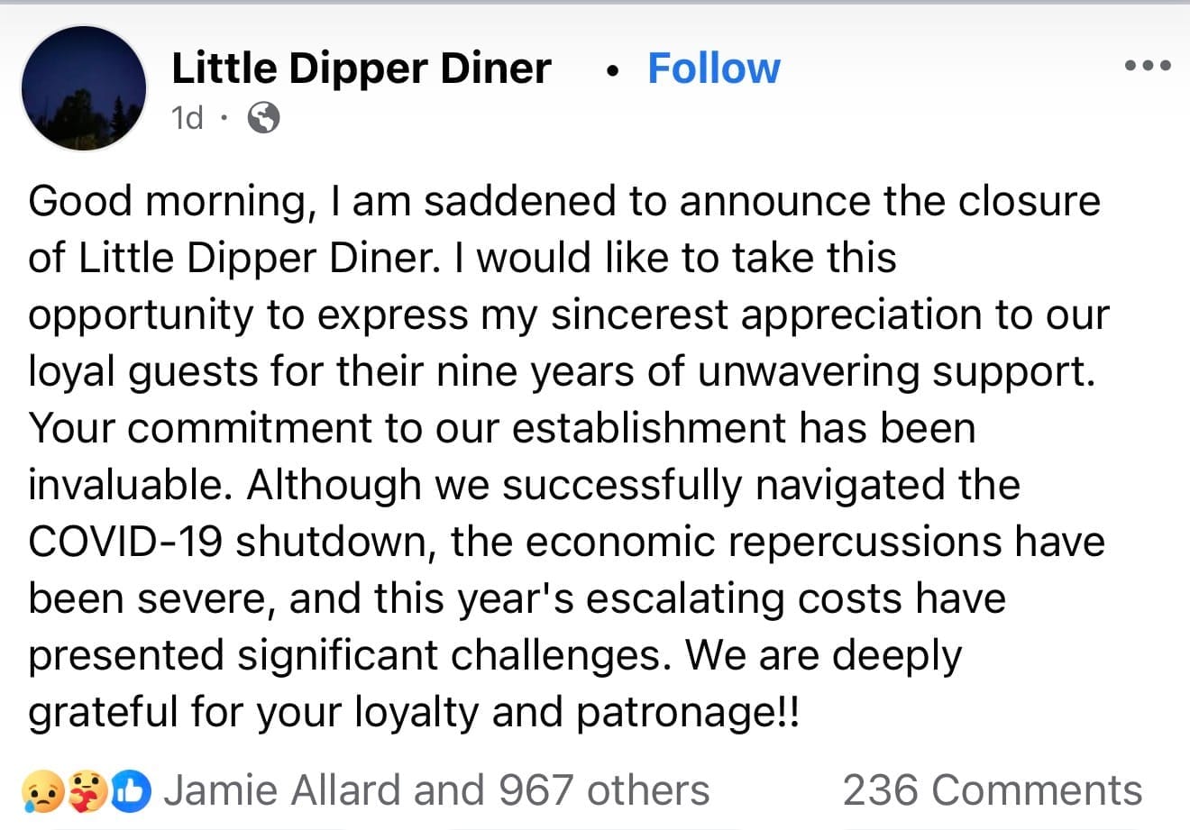 In a farewell Facebook post, the owners thanked loyal customers for their “unwavering support” and cited the usual suspects - pandemic aftershocks and runaway costs - although curiously, they made no direct correlation between increased costs and the disastrous Trump regime in their post.