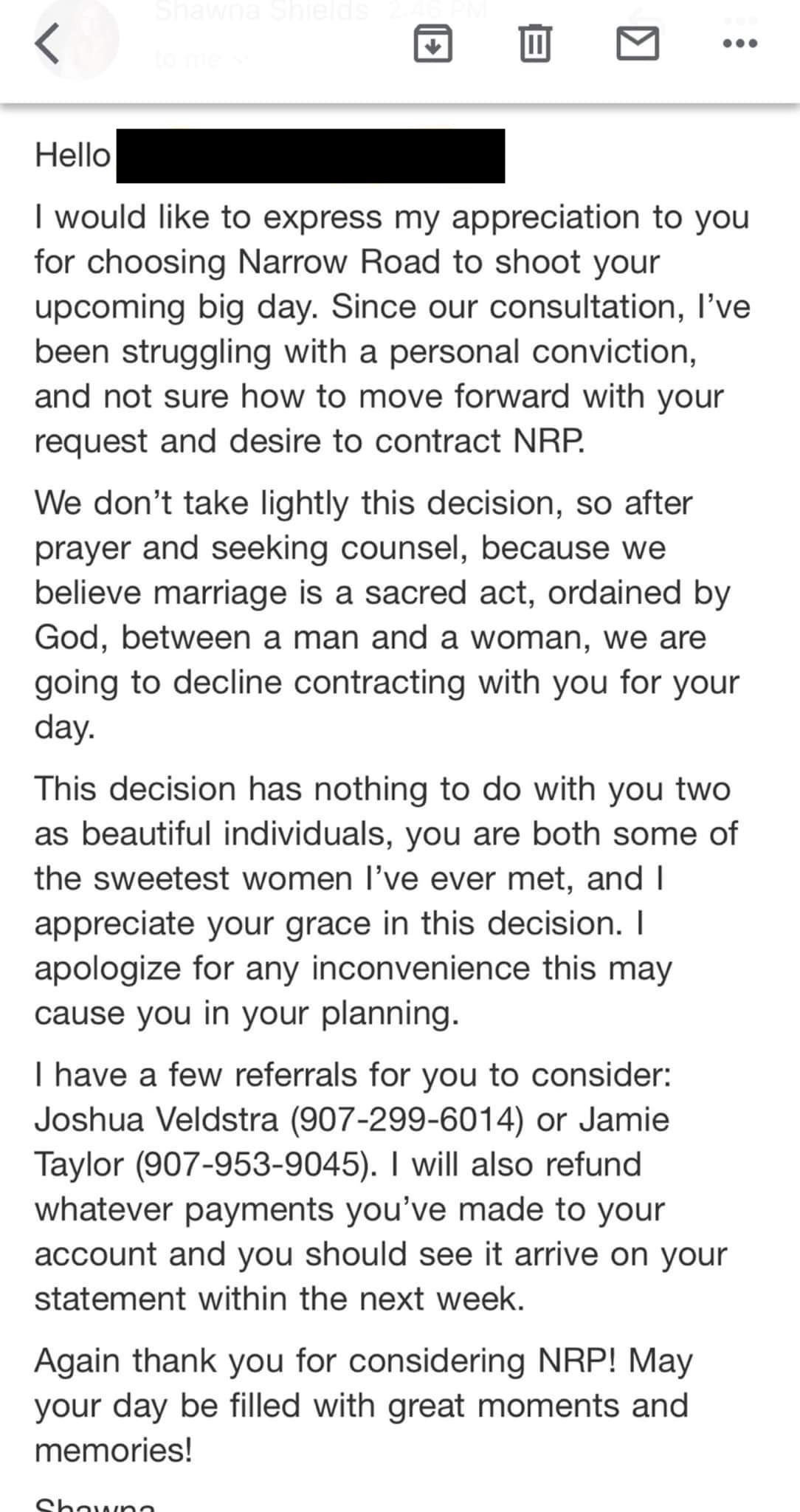 Citing a "struggle with a personal conviction" in an email sent to the couple by Narrow Roads Production photographer Shawna Shields — the email states that after prayer and seeking counsel, believing that marriage is a sacred act ordained by God, between a man and a woman, the business was declining to contract with the couple for their special day.