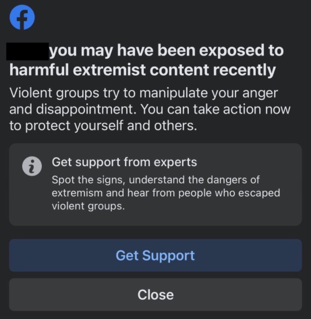 A second Facebook warning, also part of the "small test," has also been seen on the platform. The message informs users that they may have been "exposed to harmful extremist content recently," although the message doesn't identify what "extremist content" users "may" have been exposed to.