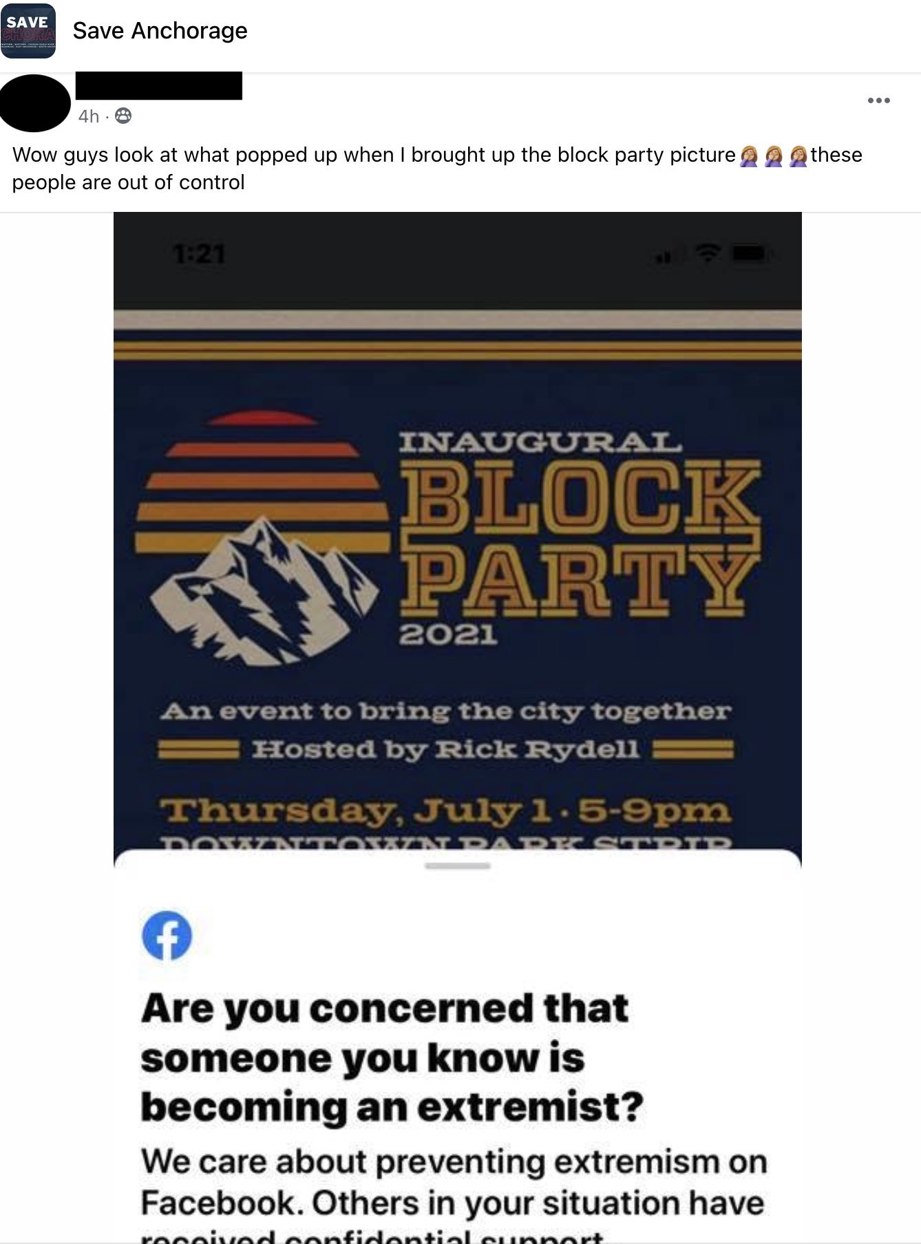 Posted to the group today by a Save Anchorage member was a screenshot taken from Facebook, which showed a post advertising an inaugural block party for Dave Bronson. Beneath the picture was a prompt asking the user whether they were concerned someone they knew was becoming an extremist.