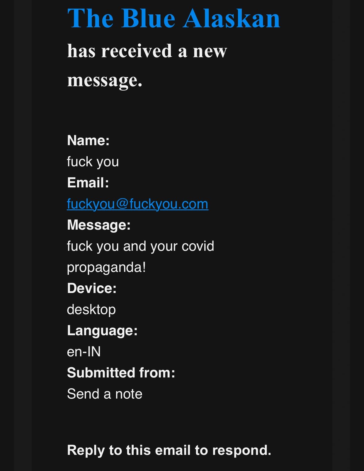Thank you for taking the time out of your busy day of non-mask wearing to write me an email expressing your exceedingly great displeasure with my "propaganda" writing.