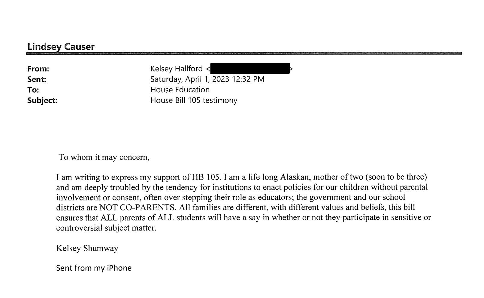 Treasurer Kelsey Shumway shares a familial relationship with her Moms for Liberty colleague, Lynn Hallford. On April 1, 2023, just days before Moms for Liberty announced the opening of its Mat-Su chapter, Shumway provided written testimony in support of Governor Dunleavy's discriminatory parental rights bill, HB 105.