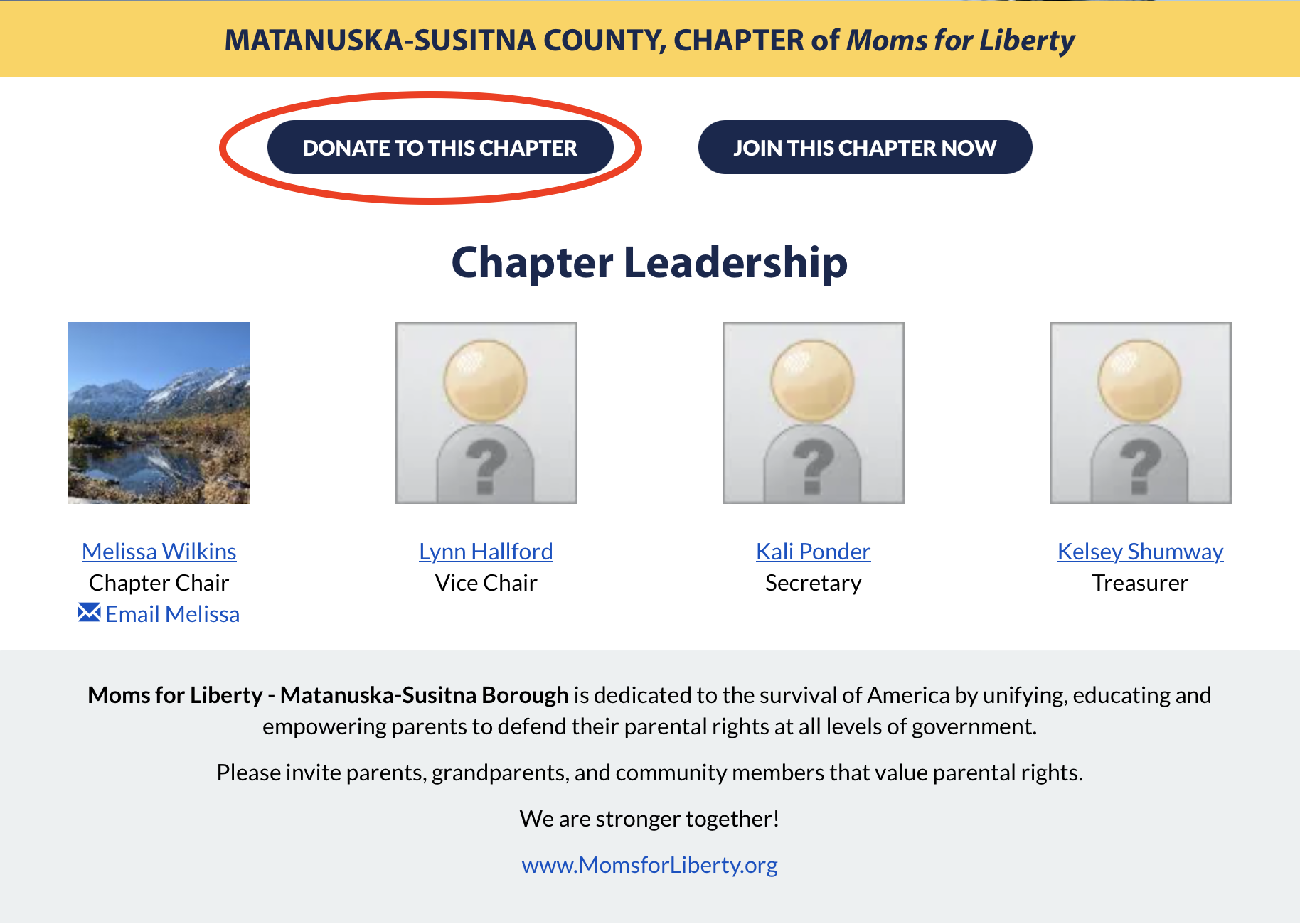 As an interesting aside, a link on the Moms for Liberty website encourages individuals to donate directly to its Mat-Su chapter. The link directs visitors to an Anedot donation page which warns individuals they are limited to contributing $3,300 per election to any candidate and their authorized political committees with respect to