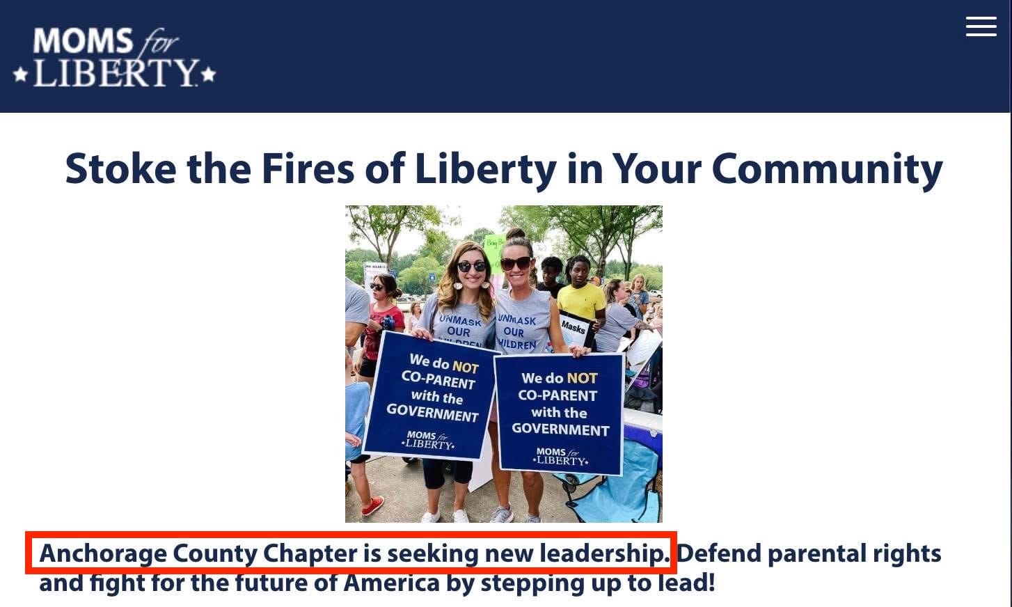 Following in the footsteps of Save Anchorage, Moms for Liberty Anchorage has closed its doors. Their Facebook page, containing a small handful of followers, is gone, and a notice on the national Moms for Liberty website states that the local chapter is seeking "new leadership." It is noteworthy that an organization built entirely on making as much noise as possible quietly slipped out the back door without a single press release or making so much as a peep!