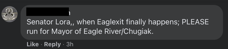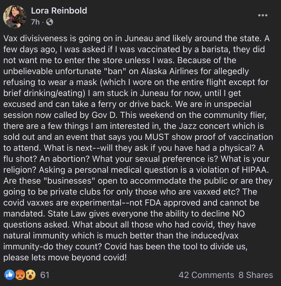 Anyway, Reinbold says this all violates HIPAA, and the rest of her post eventually devolves into a hot mess of calling the Covid-19 vaccine "experimental" and refers to "natural immunity." A Reinbold supporter thinks she should run for Mayor of Eagle River/Chugiak. Wild.