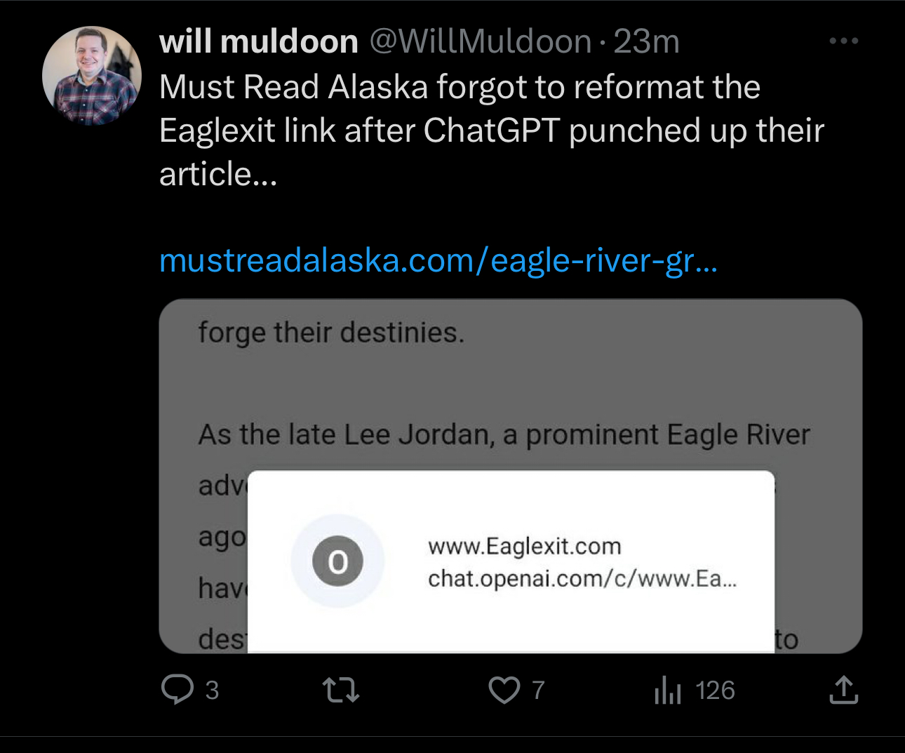 Muldoon posted a screenshot to social media appearing to show that a link in a Must Read Alaska blog post that should have directed visitors to the website of Eaglexit, actually directed readers to the ChatGPT website.