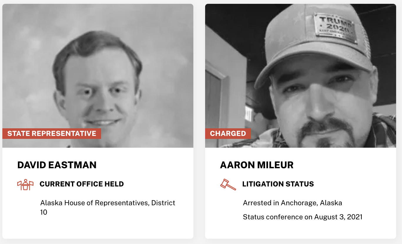 Alaskan Representative David Eastman, R-Wasilla; and Wasilla resident Aaron J. Mileuer — a now former member of the far-right Save Anchorage Facebook group, appear listed in the database.