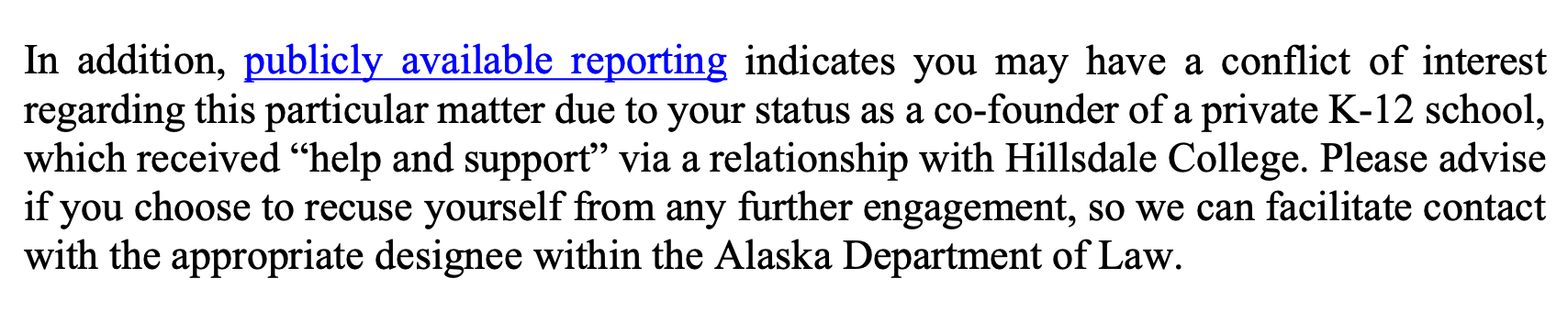 The District also raised concerns in its response about a potential conflict of interest involving AG Cox. ASD pointed out that Cox co-founded a private K-12 school that received “help and support” through a relationship connected to Hillsdale College, the same organization whose materials are at issue. ASD asked Cox to clarify whether he would recuse himself should the matter continue within the Department of Law.