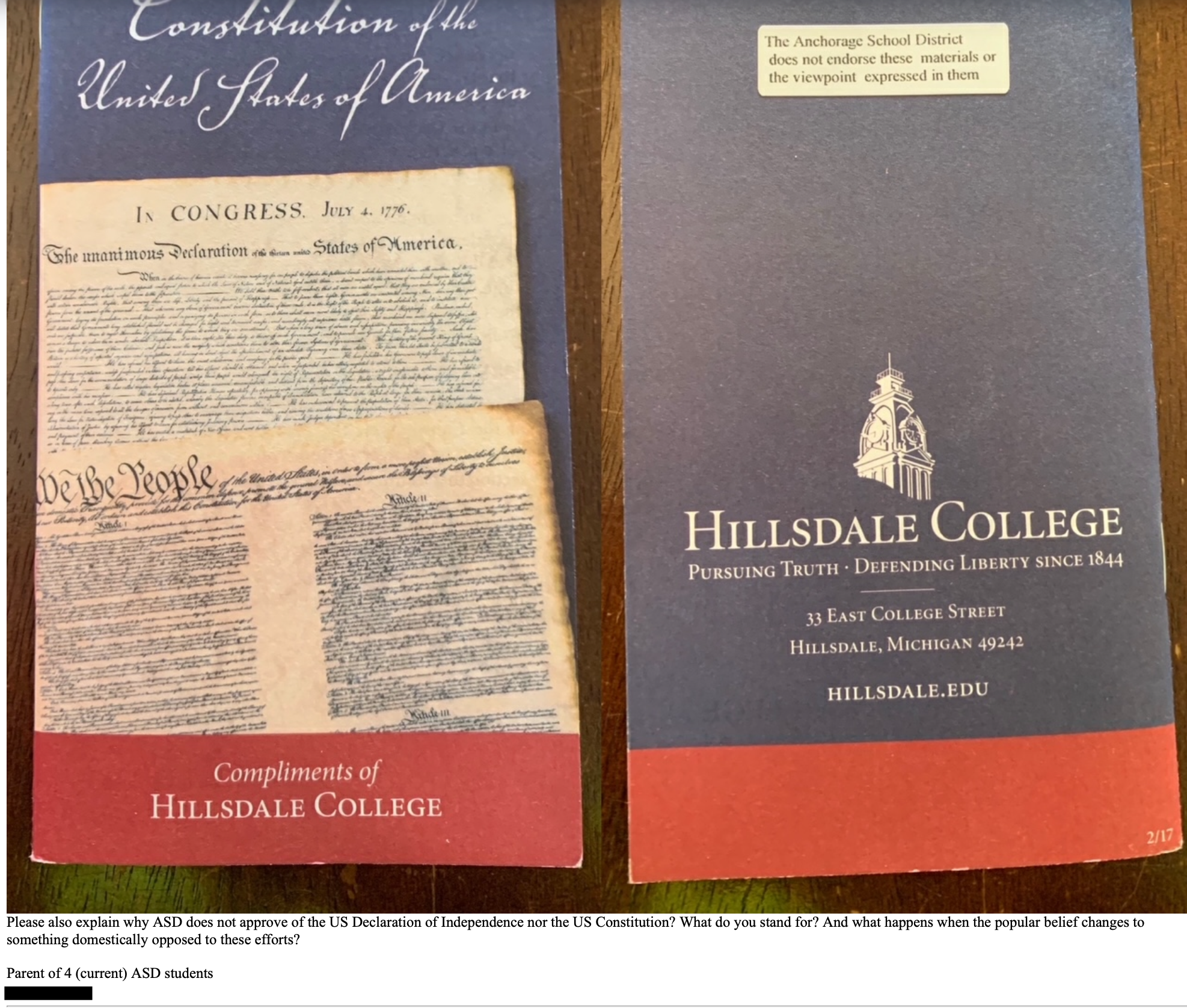 In a formal response to AG Cox obtained by The Blue Alaskan via public information request, the Anchorage School District said the placement of a non-endorsement sticker on Hillsdale College pamphlets (editorialized propaganda) was not an act of political interference, but the result of a procedural rule adopted during Bishop’s tenure. The District said the sticker was applied by an individual unaffiliated with ASD who followed the guidelines established by Bishop regarding how outside organizations must label their materials before distributing them on school property.