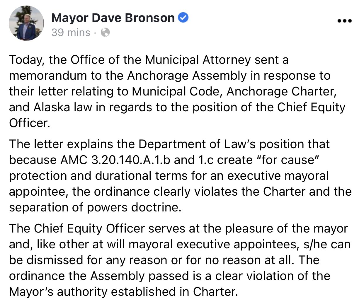 Under the cloak of darkness during last evening's special meeting of the Anchorage Assembly, Mayor Bronson took to Facebook to share his administration's position on the firing of Armstrong III, claiming that the ordinance passed by the Assembly was a "clear violation of the Mayor's authority established in Charter."