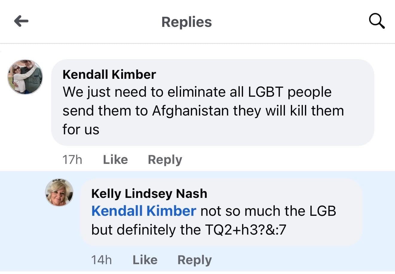 That excuse collapses under the weight of the words on the screen. The comment she responded to said LGBT people should be sent to Afghanistan, where they would be killed. Nash read that, responded to it, and carved out which letters of the acronym she thought were worthy of elimination.